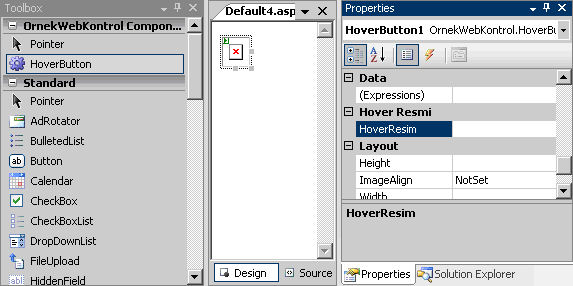 Görüldüğü gibi sadece ImageUrl property’sini set ettiğimiz için onMouseOver ve onMouseOut nitelikleri boş tanımlandı. Dolayısıyla HoverButton kontrolü, kullanıcı HoverResim propertysine değer girildiği zaman anlamlı olacaktır yoksa normal bir ImageButton’dan bir farkı olmayacaktır. Eğer HoverResim property’sini set edersek çıktığı aşağıdaki gibi oluşur.